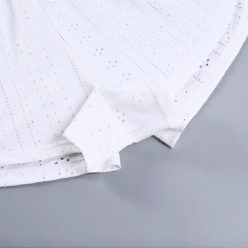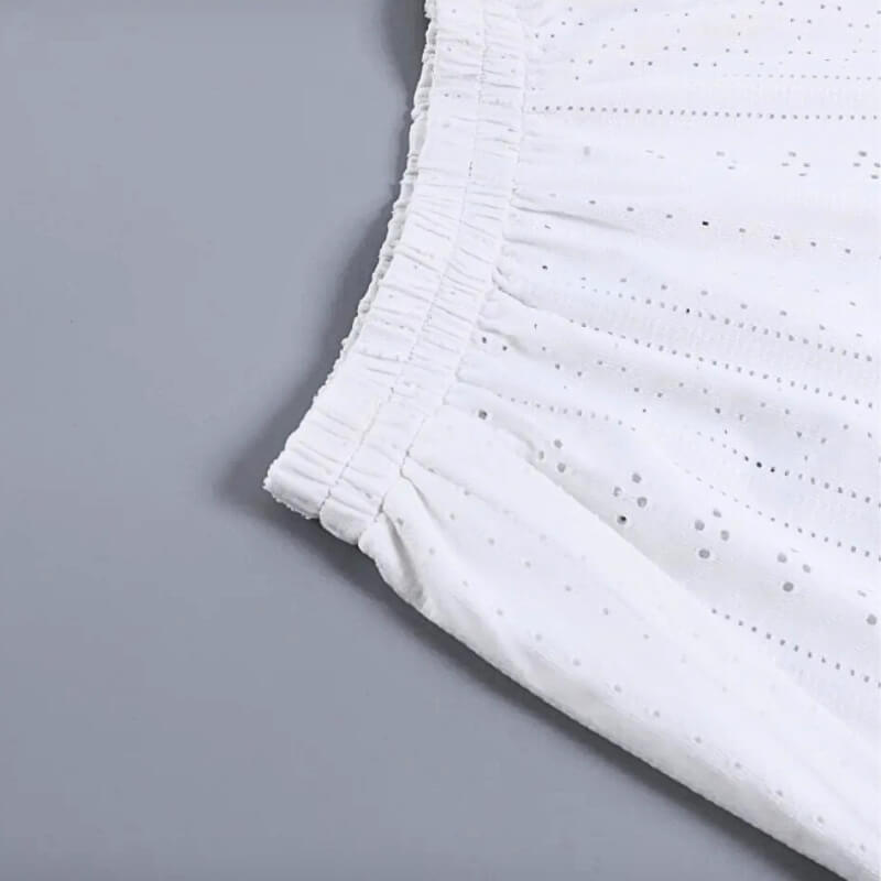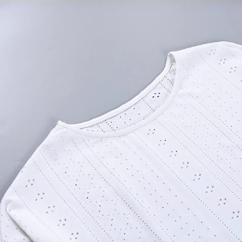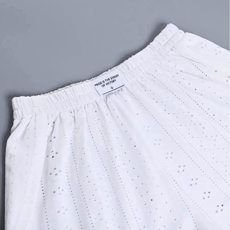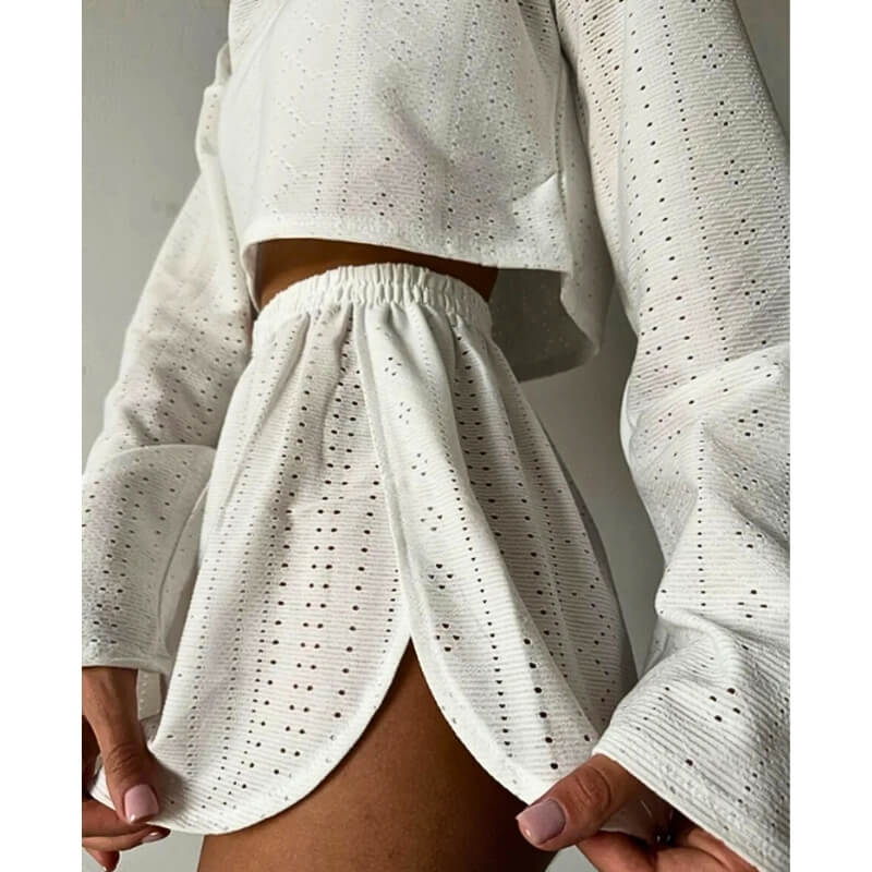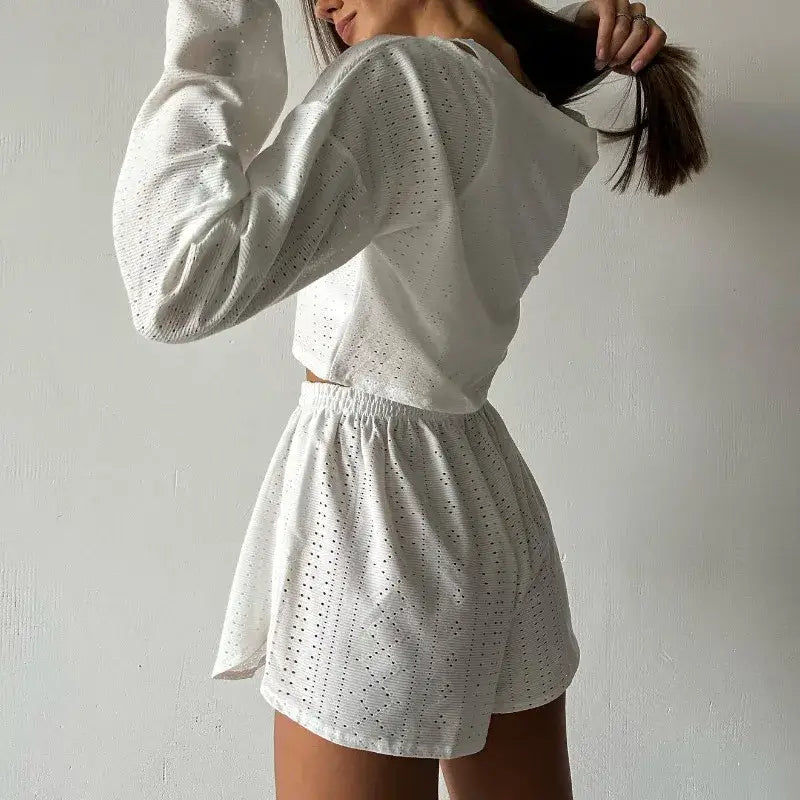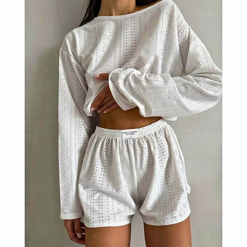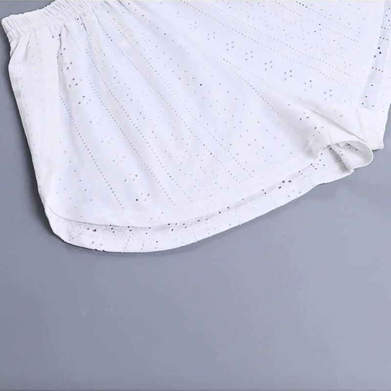 Delicate dotted vertical patterns with tiny perforations add visual charm and exceptional breathability to this feather-light matching set. An easy and versatile piece to lounge in breezy comfort or run errands in effortless style. It feels like a breath of fresh air.