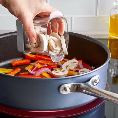 Slice fresh fruits and veggies fast with the Cup Slicer. Just put your food on a cutting board and place the Cup Slicer, which features five stainless steel serrated blades, above the food. Then, push it down until all your food is sliced. Pour your freshly sliced food into your cereal, a fry pan, or a bowl. And when you’re done using it, run it through the dishwasher and place the blade cover on it for safe storage.
