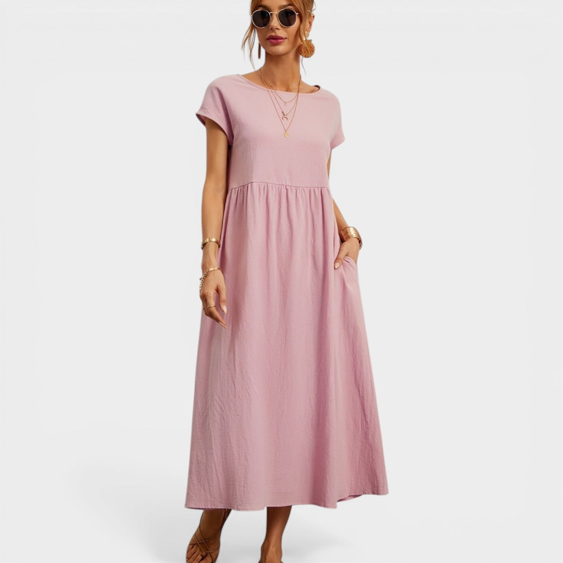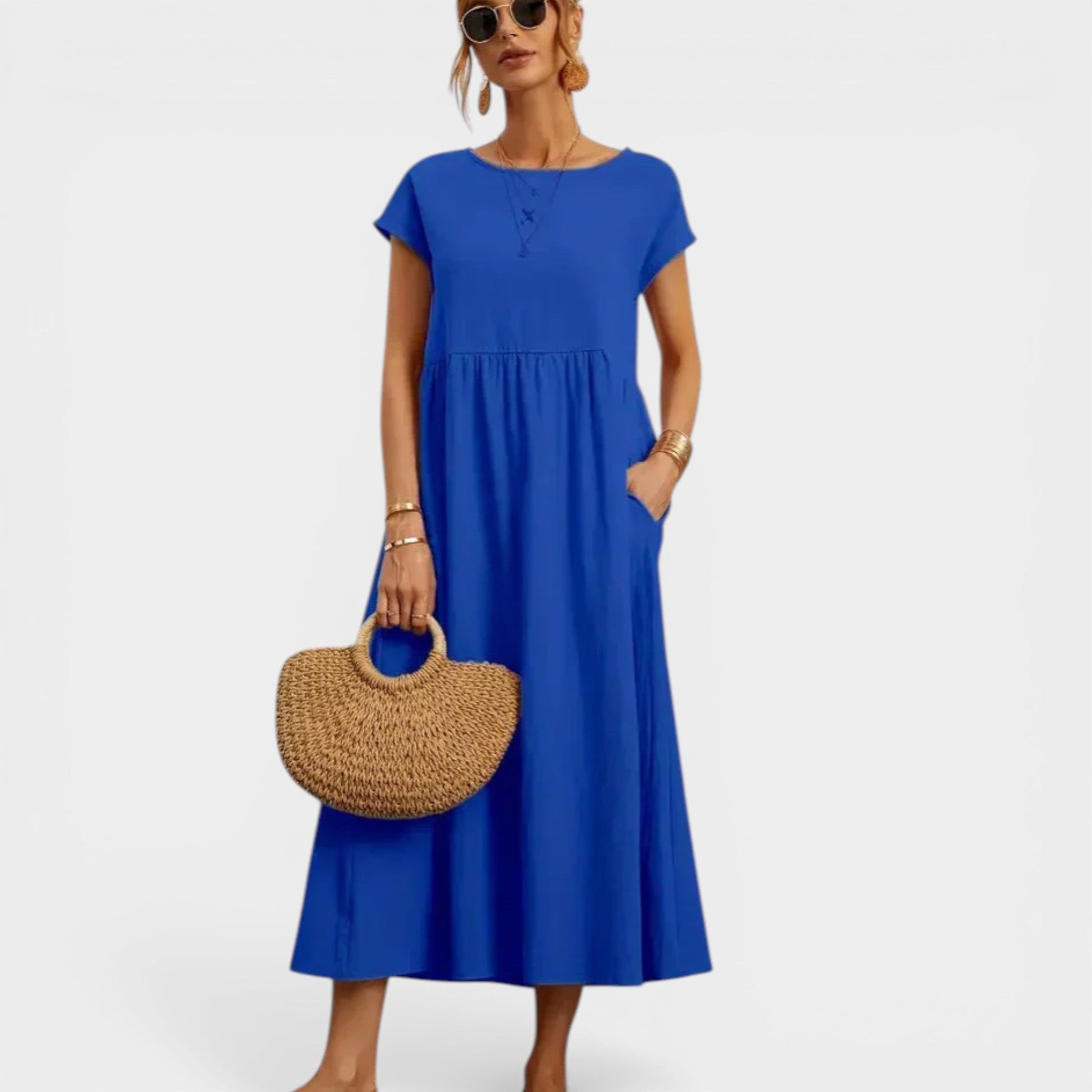 Ova jednostavna, ali elegantna haljina savršena je za udoban i moderan svakodnevni izgled. Izrađena od laganog i prozračnog materijala, pruža osjećaj svježine i slobode tijekom cijelog dana. Opušteni kroj s kratkim rukavima i blago nabrani donji dio stvaraju ležeran, ali ženstven izgled, dok praktični džepovi dodaju funkcionalnost.