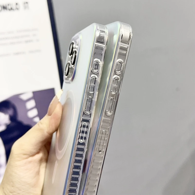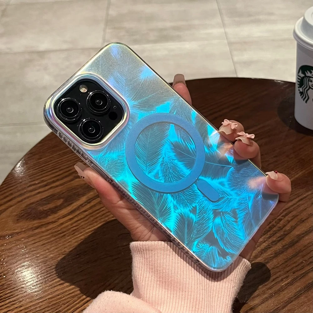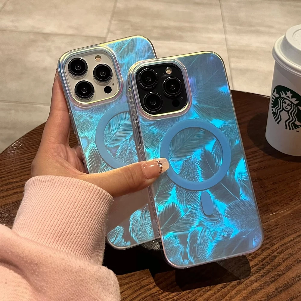 Luxury Feather Laser Aurora Magsafe Case for iPhone 15 16 14 11 12 13 Pro Max Acrylic Armor PC Shockproof Cover for iPhone 15Pro