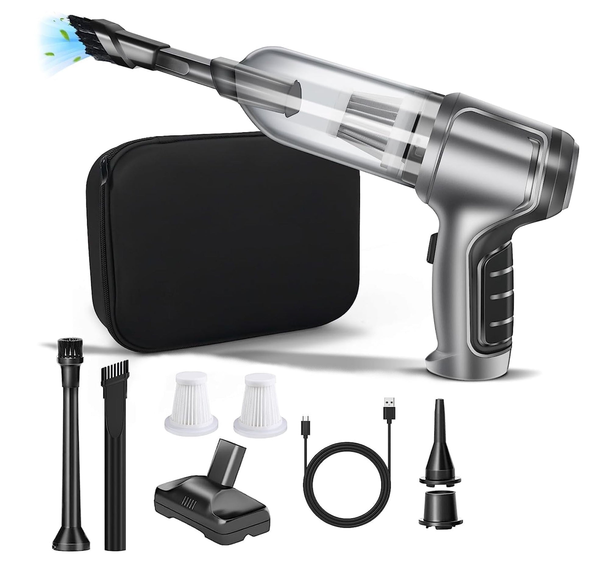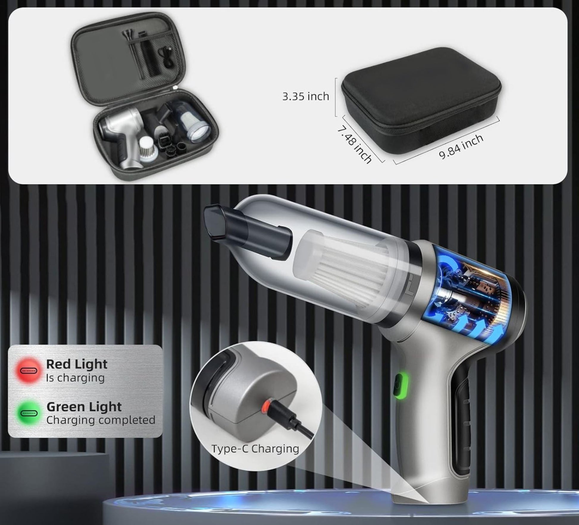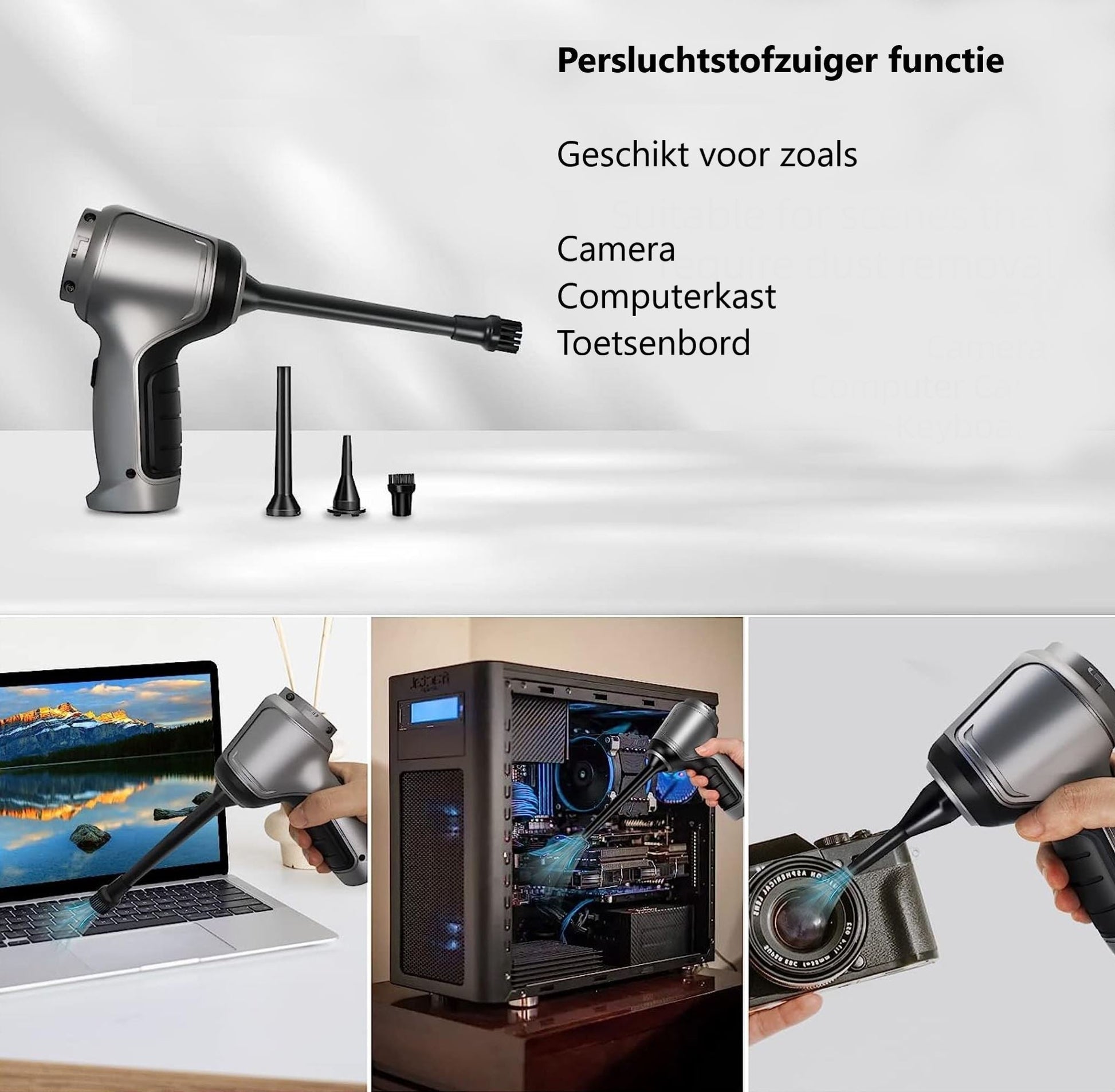 Compact en draadloos, eenvoudig op te bergen in uw auto of huis. Deze krachtige handstofzuiger zuigt niet alleen vuil en stof op, maar kan ook blazen, waardoor het een veelzijdige 2-in-1 oplossing is. Maak schoonmaken een fluitje van een cent met deze handige en efficiënte draadloze handstofzuiger.