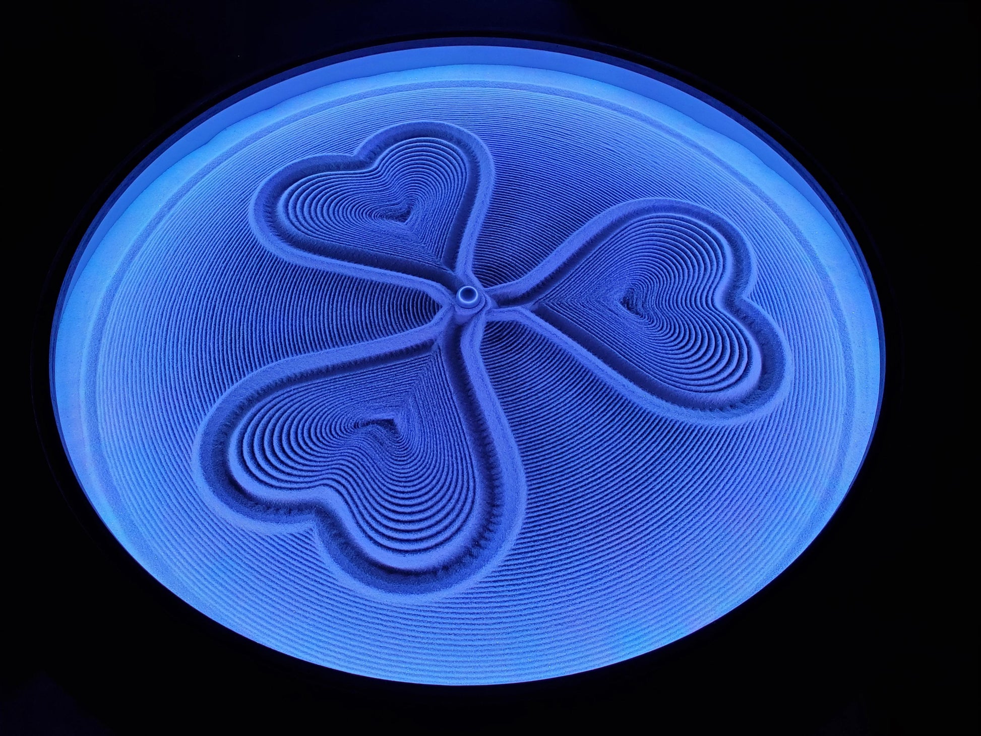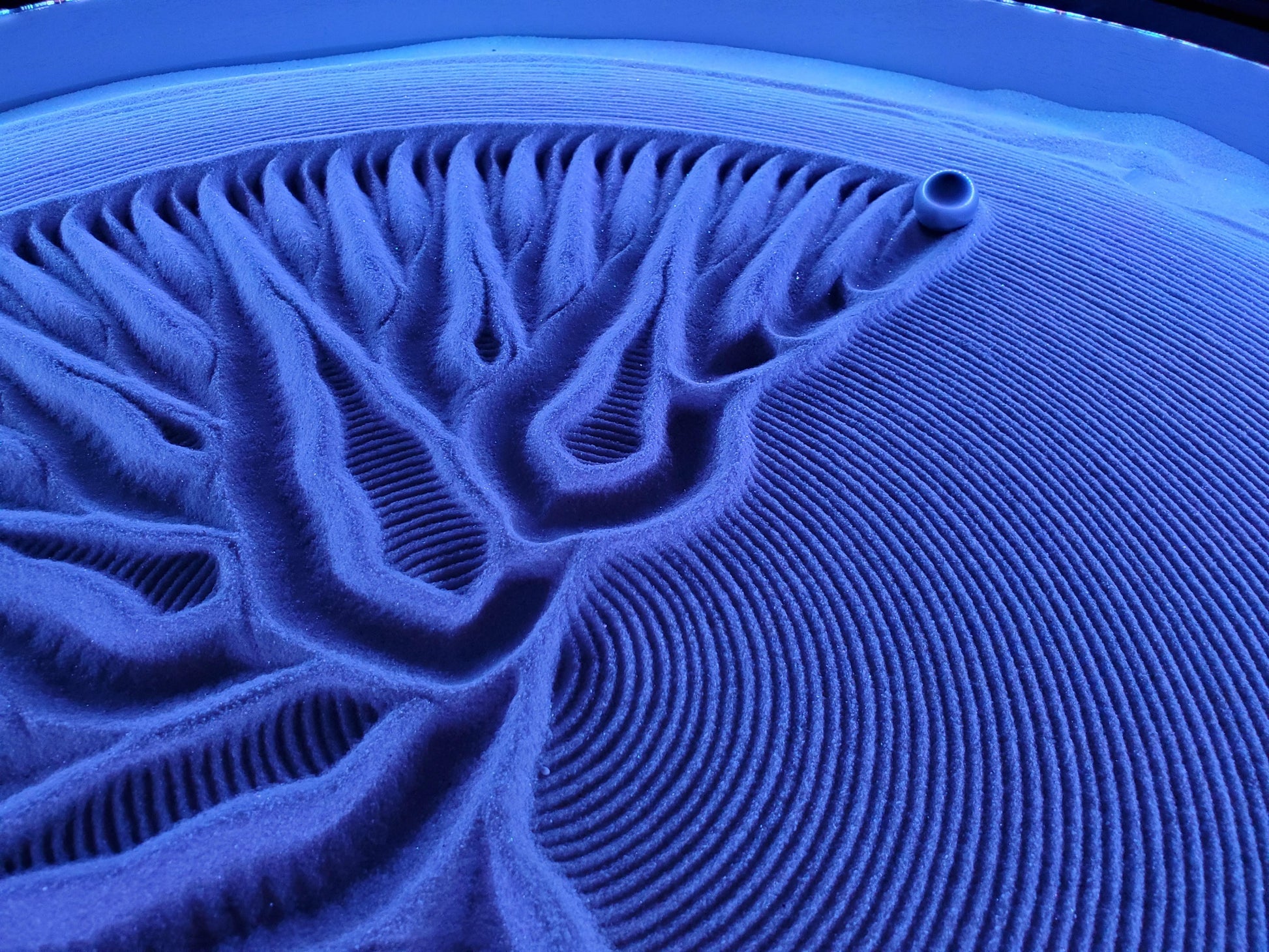 At the heart of the OrbaNetic™ is a Wifi-connected two-motor robot which magnetically pulls a steel ball through a field of sand. This is what creates OrbaNetic’s beautiful, intricate, and endlessly changing patterns. This quiet machine keeps the experience calming. At average speeds, you can only hear the soft ‘crunching’ of the ball rolling over sand. With its tempered glass top, OrbaNetic™ is not just a sculpture, but a fully functional coffee table.