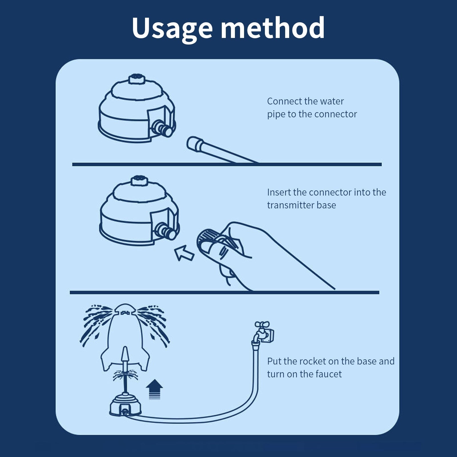 Simply connect the water pipe to the connector, insert it into the transmitter base, place the rocket on the base, and turn on the faucet for hours of outdoor playtime. Ignite your child's imagination and learning with our Rocket Launcher Sprinkler!